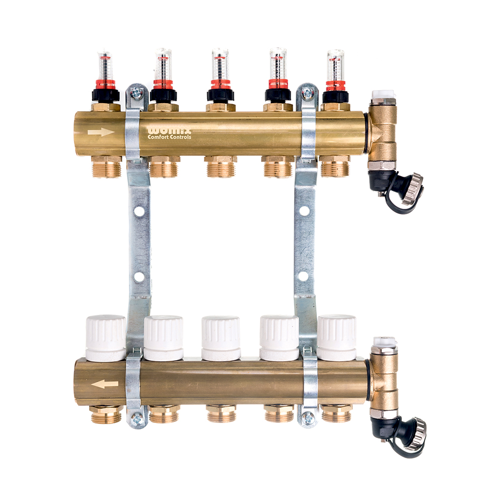 Mosiężny rozdzielacz centralnego ogrzewania CM-NTRot posiada dwie belki mosiężne profil C z gwintami G 1″ GW, dwa mosiężne trójniki G 1″ z uszczelnieniem o-ring, odpowietrznikiem ręcznym i zaworem spustowym kątowym, nyple redukcyjne 1/2″ x 3/4″ z uszczelnieniem o-ring i połączeniem przez eurokonus, wkładki zaworów termostatycznych (gwint M30 x 1,5) pod montaż siłowników, przepływomierze (rotametry) 0,5-5 l/min oraz dwa uchwyty stalowe.