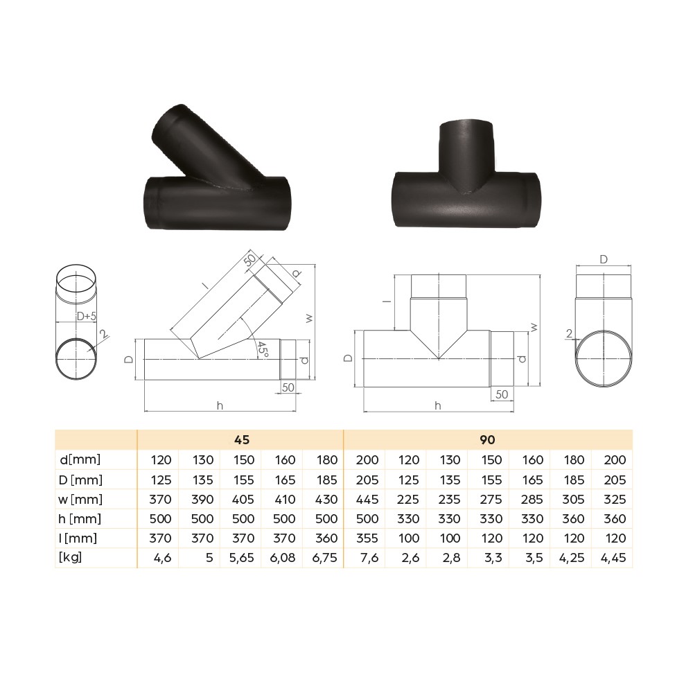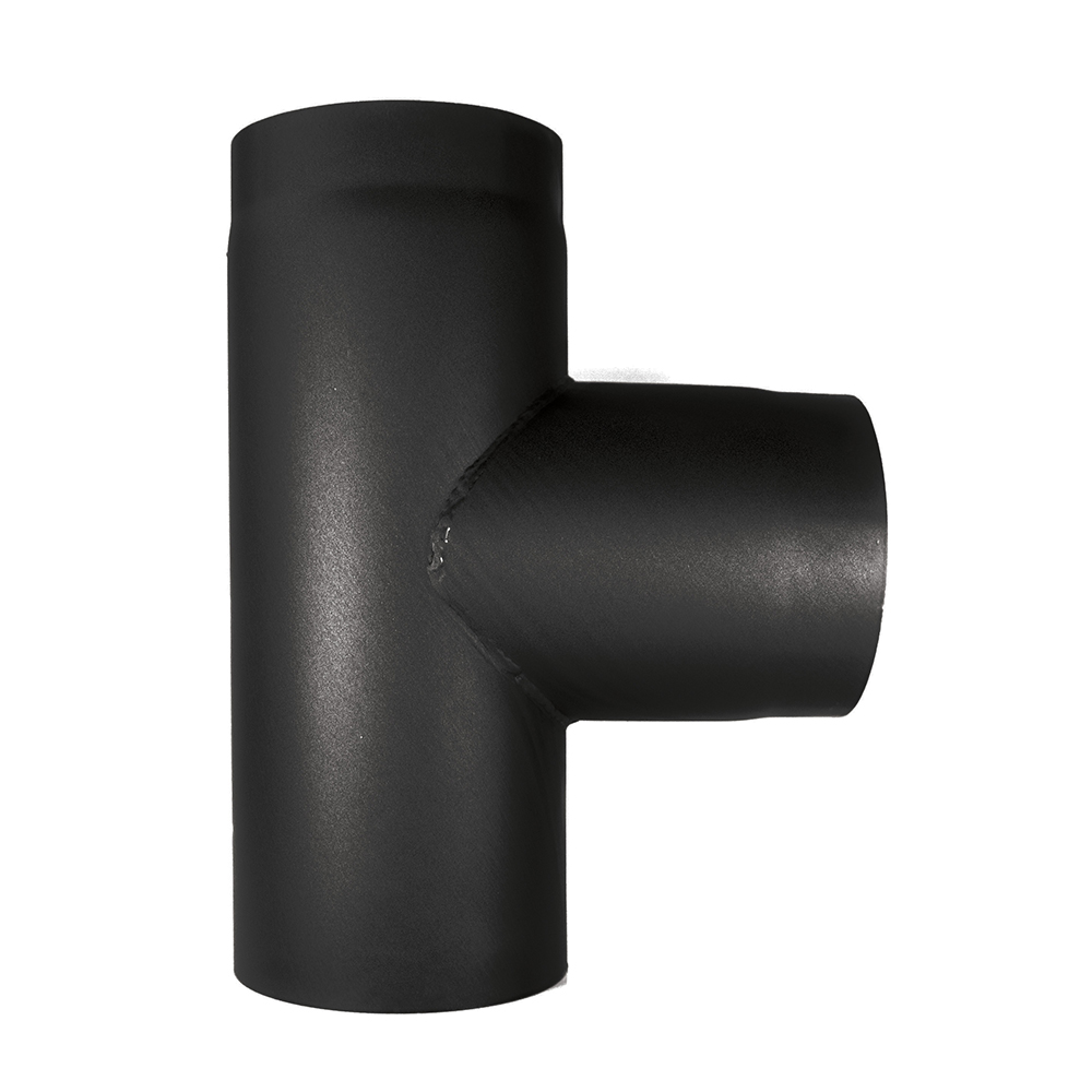 Trójnik 130 mm średnicy z wyjściem pod kątem 90 stopni. Trójnik 90° z 2mm blachy czarnej służy do budowy przyłączy do odprowadzenia spalin z kominków i urządzeń grzewczych na paliwa stałe.