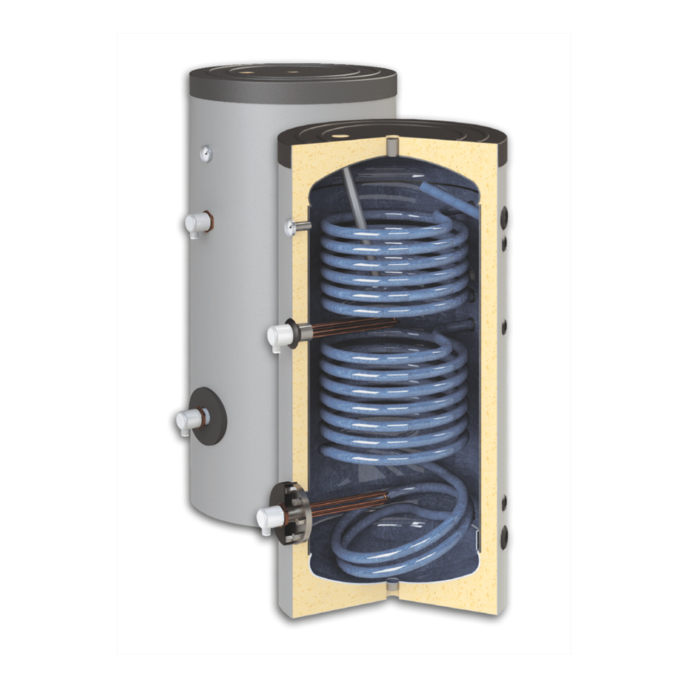 Model V2 502 G z dwiema wężownicami, przeznaczony do współpracy z kolektorami słonecznymi oraz wysokotemperaturowym źródłem ciepła.