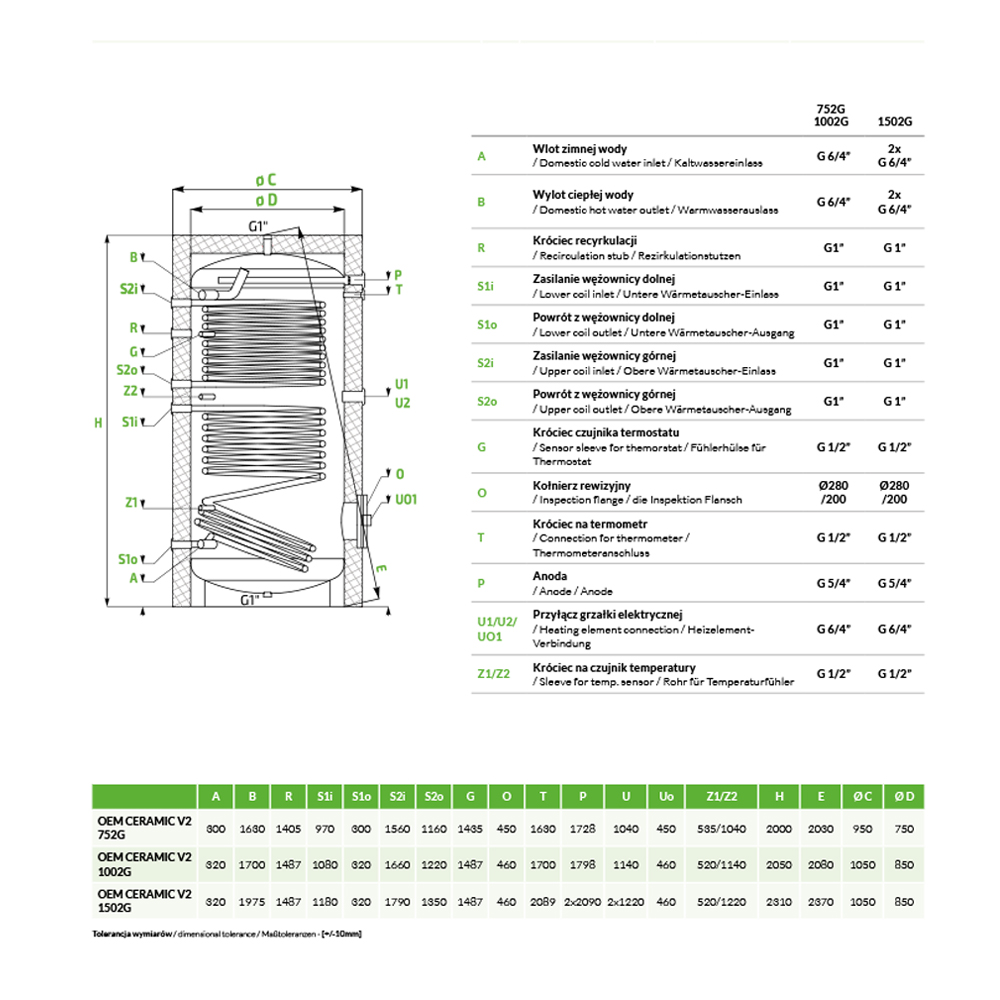 Model V2 752 G z dwiema wężownicami, przeznaczony do współpracy z kolektorami słonecznymi oraz wysokotemperaturowym źródłem ciepła.