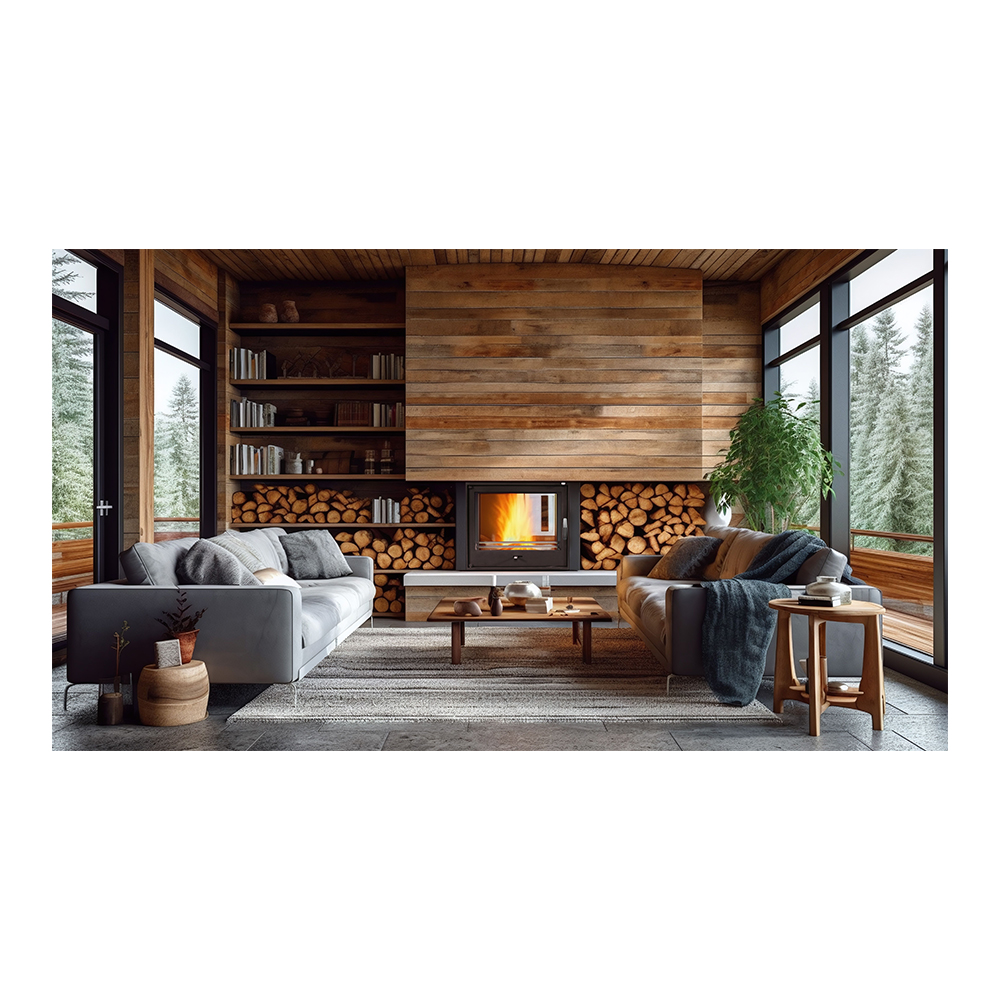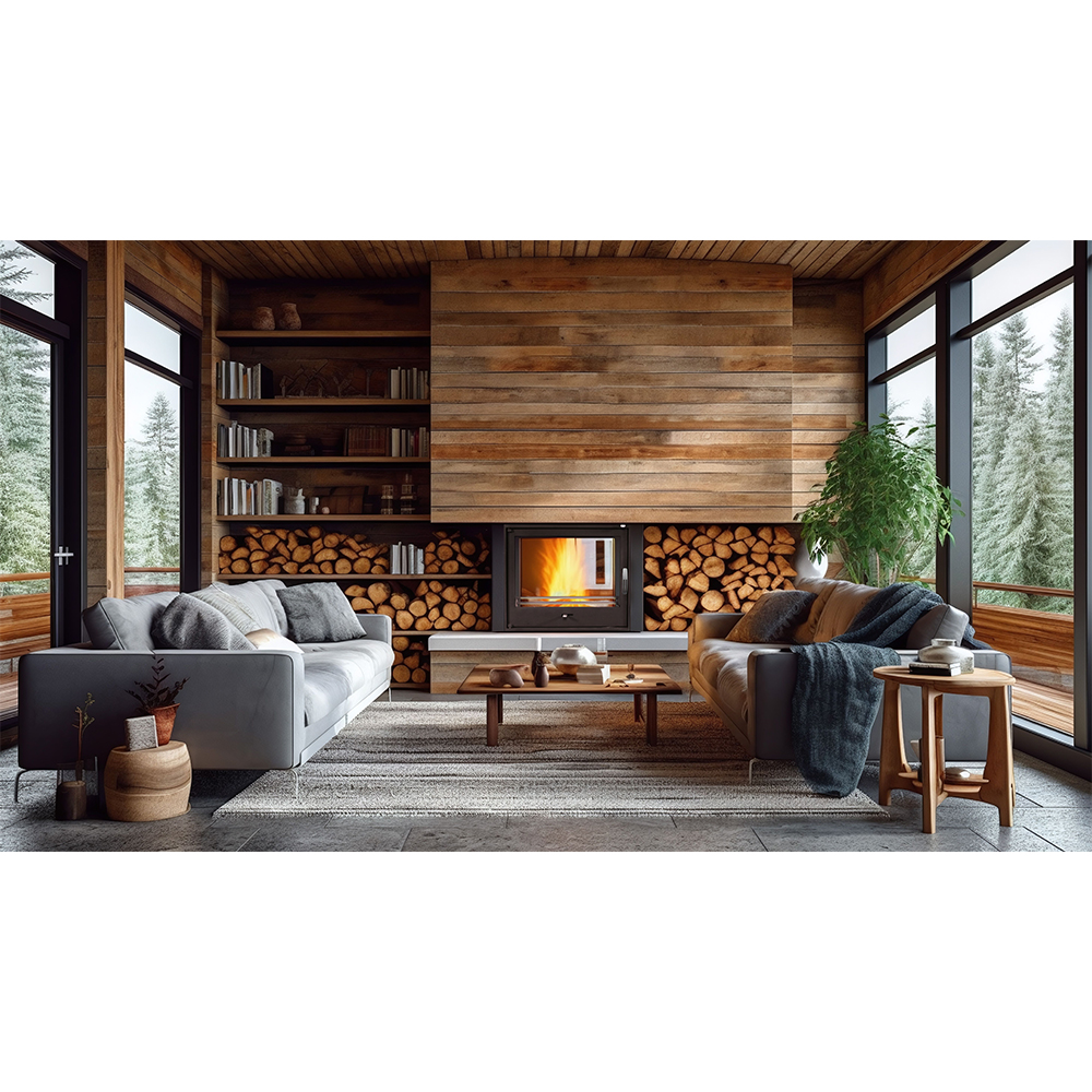 W wersji podstawowej kominek posiada regulowane stopy: zakres regulacji 40 mm, pozwalające go wypoziomować, strukturalną powłokę frontu, satynowe okucia i klamkę. Drzwi otwierają się standardowo na lewą stronę – zawias po lewej stronie, klamka po prawej (otwieramy kominek lewą ręką i prawą realizujemy załadunek drewna). Jest to opcja odpowiednia dla osób praworęcznych i nie ma możliwości jej zmiany w tym modelu. W kominku PLUS mamy możliwość dołożenia dodatkowego stojaka.