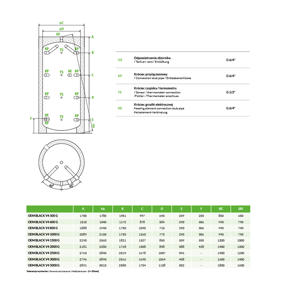 Zbiornik buforowy OEM BLACK V4 600l bez wężownicy przeznaczony jest do zwiększania zładu układu C.O. (woda kotłowa) oraz magazynowania ciepła. Zbiornik jest wykonany ze stali węglowej, a efektywna i energooszczędna izolacja z pianki poliuretanowej. Zbiornik wpisany jest do europejskiej bazy EPREL i ma klasę energetyczną B. Można podłączyć do niego grzałkę elektryczną dzięki dużej ilości króćców ([KP] Króciec przyłączeniowy – G 6/4” – 8 sztuk).